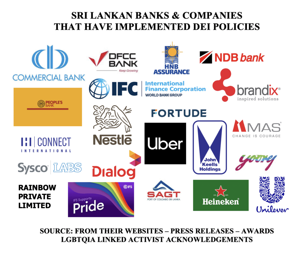 Below is a documented list of Sri Lankan companies that have officially adopted DEI policies—knowingly linking themselves to LGBTQIA compliance frameworks through partnerships, donor programs, or HR policy changes.