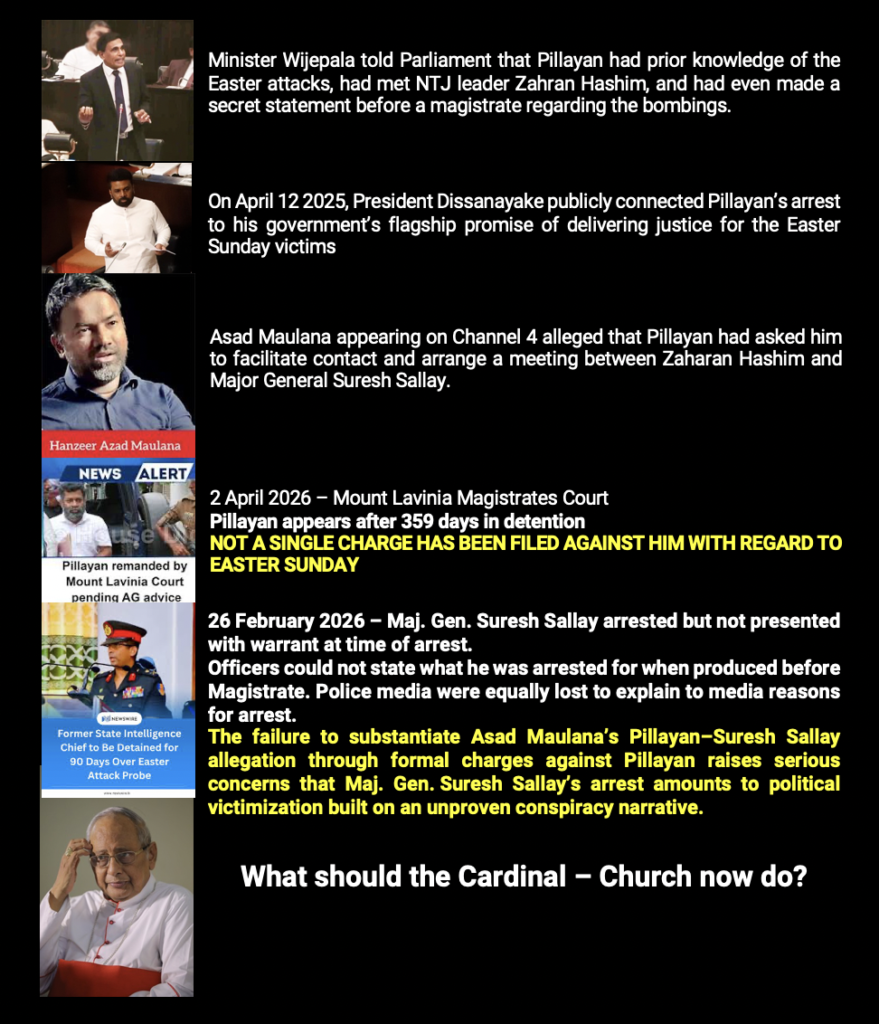 After restoring the investigators the Cardinal trusted, securing presidential PTA authority, and detaining Pillayan for 359 days and going further to even arrest Maj. Gen. Suresh Sallay, the evidentiary gap can no longer be blamed on process, personnel, or political obstruction. It points instead to the weakness of the conspiracy-theory narrative itself and the reality of political victimization.