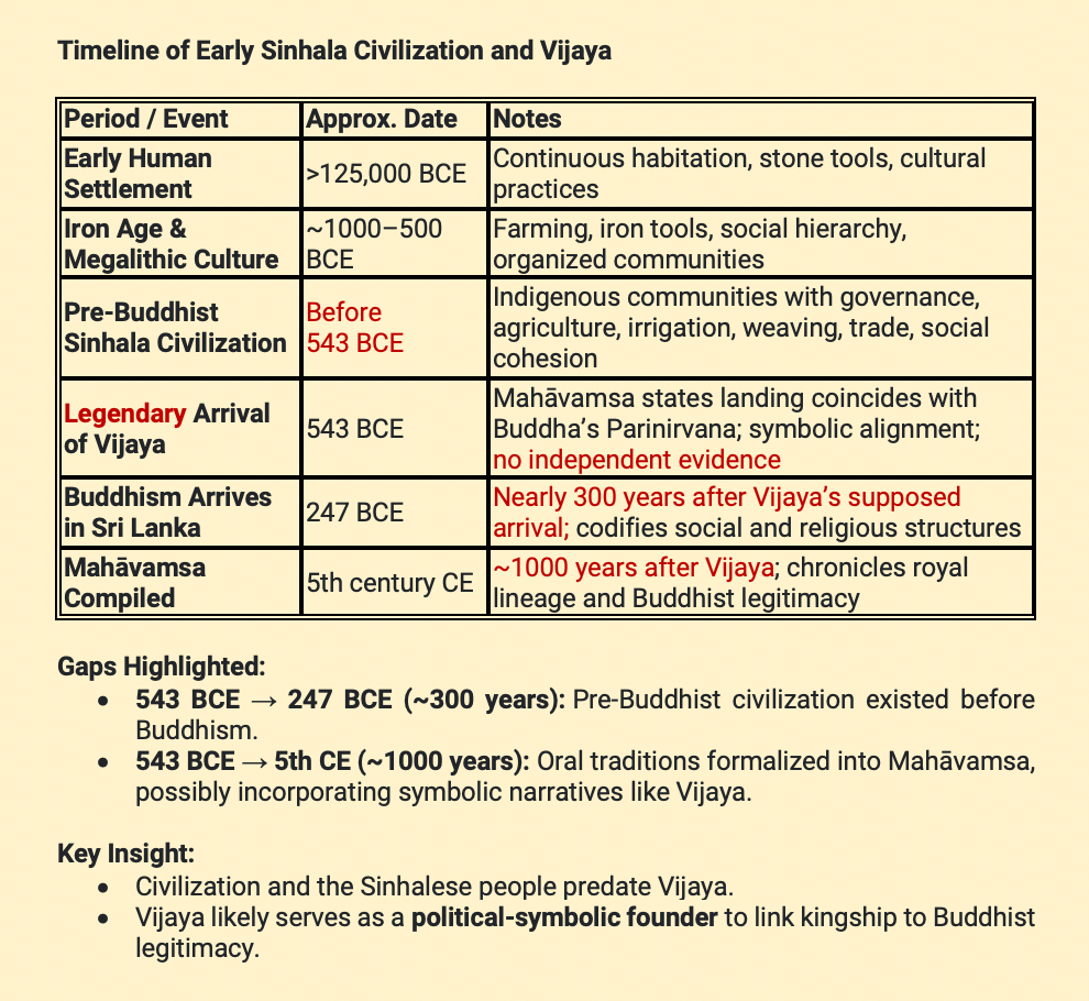 • And crucially, how does this narrative align with the historical fact that Buddhism, which the Mahāvamsa itself frames as the civilizational anchor, only arrived in Sri Lanka centuries later around 247 BCE with Mahinda, nearly 300 years after Vijaya’s supposed landing in 543 BCE?